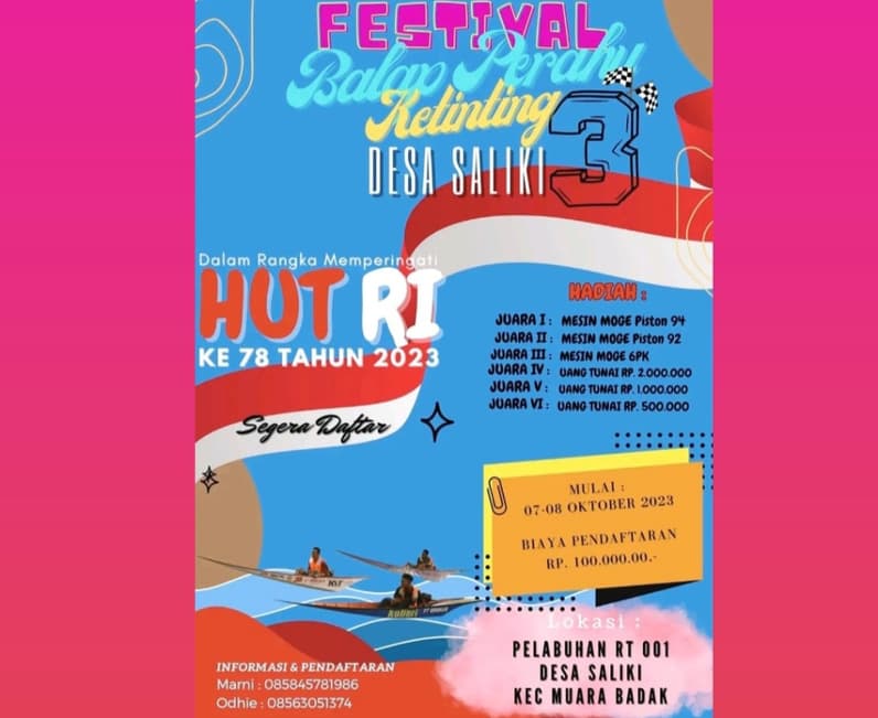 Tenggarong - Pemerintah Desa (Pemdes) Saliki, Kecamatan Muara Badak, Kutai Kartanegara (Kukar) bakal menggelar festival balap Perahu Ketinting di Pelabuhan RT 1 pada 7-8 Oktober 2023.