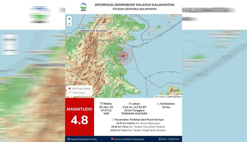 Tarakan – Gempa bumi tektonik berkekuatan 4,8 Magnitudo mengguncang Kota Tarakan, Kalimantan Utara (Kaltara), pada pukul 17.37 WIB, Rabu (5/11/2025). Fenomena gempa bumi yang cukup kuat tersebut sontak mengagetkan masyarakat.