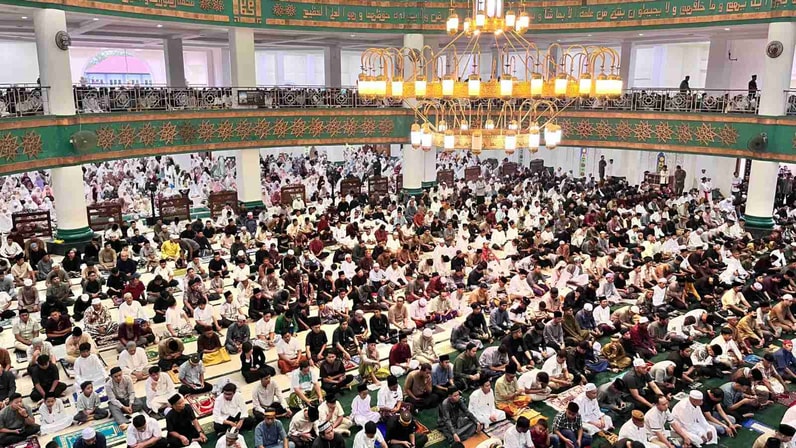 Tanjung Redeb - Hujan yang mengguyur sejak pagi tidak menyurutkan antusiasme ribuan jemaah untuk melaksanakan Salat Idulfitri 1447 Hijriah (H) di Masjid Agung Baitul Hikmah Tanjung Redeb, Sabtu (21/3/2026).