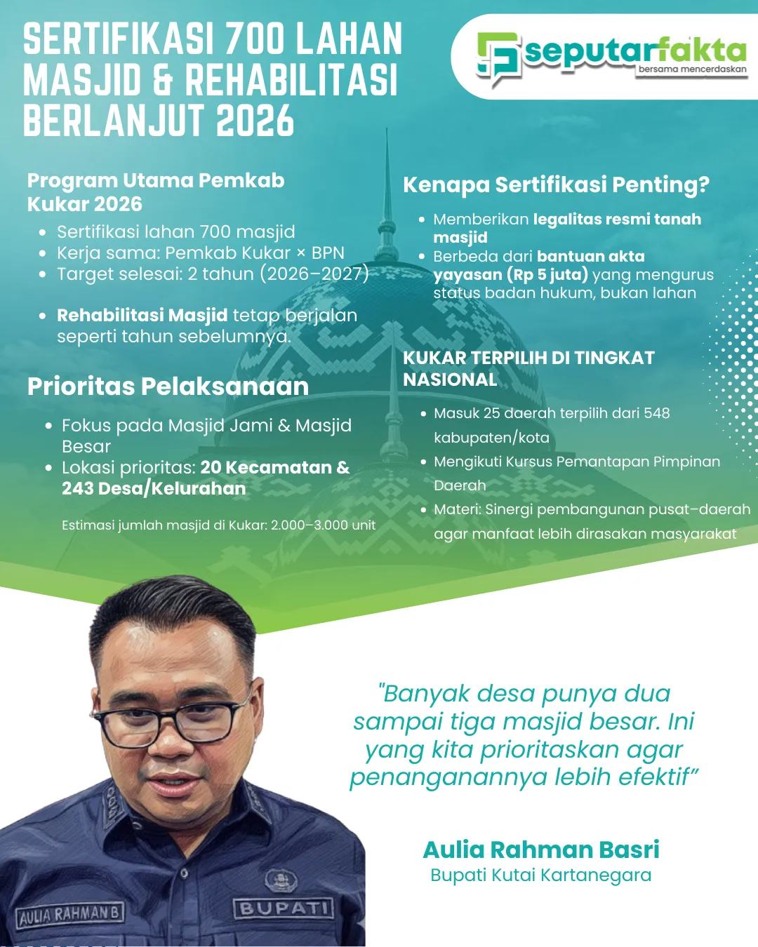 Terkait program keagamaan, Aulia menegaskan bahwa Pemkab Kukar tidak hanya fokus pada perbaikan bangunan masjid. Tahun 2026, Pemkab bersama Badan Pertanahan Nasional (BPN) akan menargetkan sertifikasi lahan untuk sekitar 700 masjid, terutama masjid besar di kecamatan dan desa.