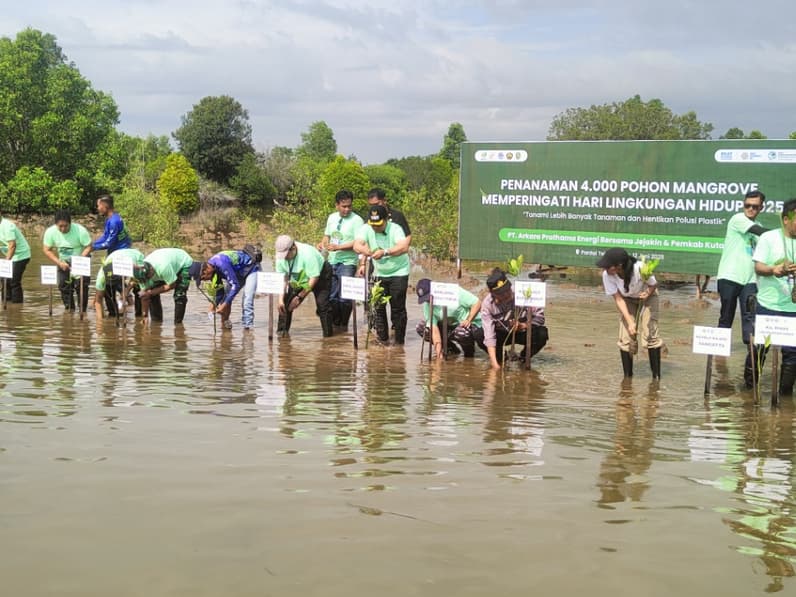 Sangatta – PT Aksara Pratama Energi (APE) bekerja sama dengan Pemerintah Kabupaten Kutai Timur (Kutim) dan platform pelestarian lingkungan Jejakin menggelar aksi penanaman 4.000 bibit mangrove di Pantai Teluk Lingga, Kecamatan Sangatta Utara, Kamis (12/6/2025).
