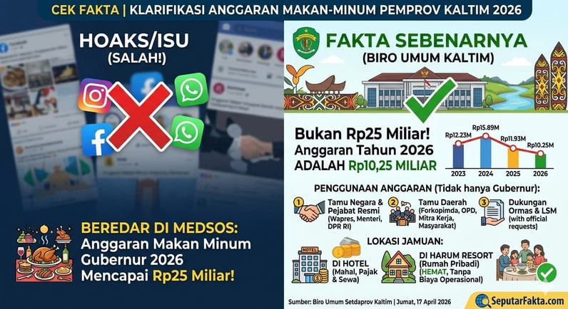 Infografis perbandingan antara disinformasi yang beredar di media sosial dengan data resmi dari Biro Umum Setdaprov Kaltim. (Ilustrasi: seputarfakta.com)