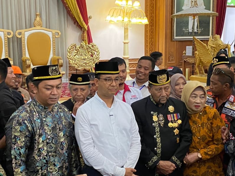 Tenggarong - Calon Presiden (Capres) Anies Rasyid Baswedan melakukan kunjungan ke Kedaton Kesultanan Kutai Kertanegara Ing Martadipura, Kecamatan Tenggarong, Kutai Kartanegara (Kukar), Kamis (11/1/2024).