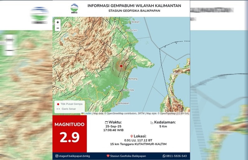 Sangatta - Gempa bumi tektonik dengan magnitudo 2,9 mengguncang wilayah Kutai Timur (Kutim), Kalimantan Timur, pada Kamis (25/9/2025) sore.
