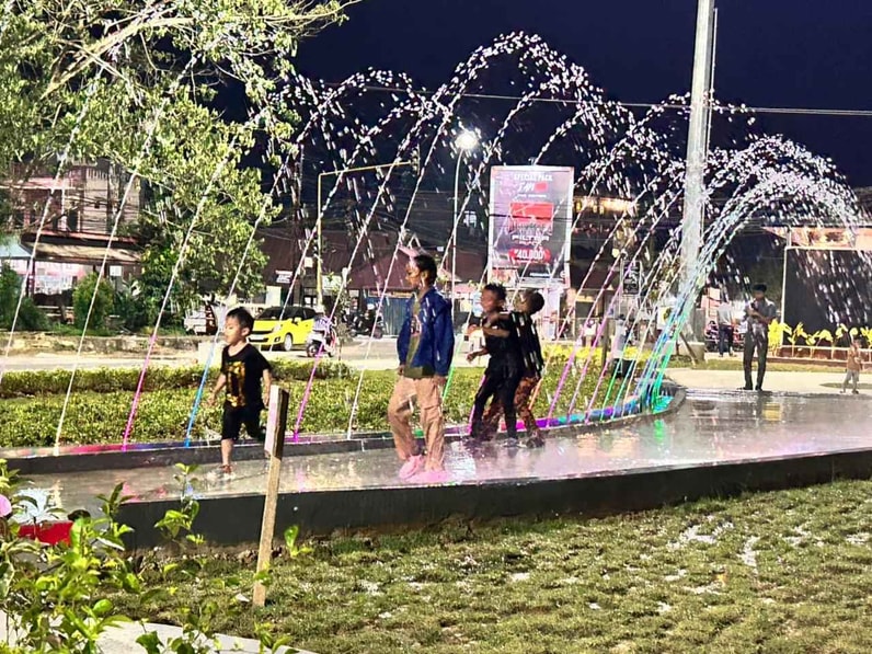 Para pengunjung, khususnya dari kalangan orang tua membiarkan anak-anaknya untuk bermain dan mandi di air mancur.