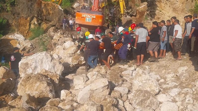 Bongkahan batu gunung itu menimpa korban beserta ekskavator yang dikemudikan saat tengah bekerja melakukan pengerukan di sekitar area masjid.
