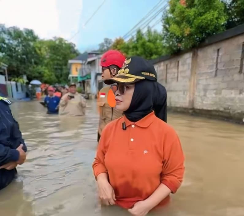Wali Kota Bontang Neni Moerniaeni saat meninjau banjir. (Instagram @jejakbundaneni)