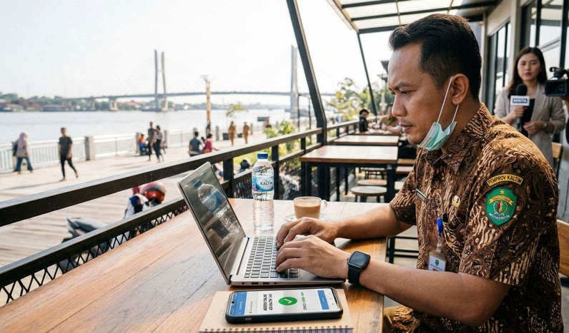 Ilustrasi ASN Pemprov Kaltim melakukan presensi daring berbasis lokasi saat menjalani sistem Work From Anywhere (WFA). (Ilustrasi: Gemini/AI)