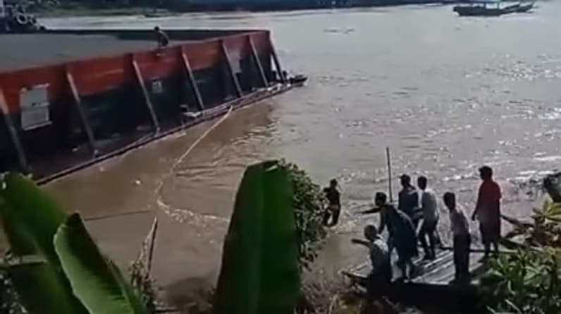 Tenggarong - Insiden kapal ponton Harmony 58 bermuatan koral menghantam sebuah cafe terapung di Kecamatan Kota Bangun, Kabupaten Kutai Kartanegara (Kukar), Jumat (14/3/2025).