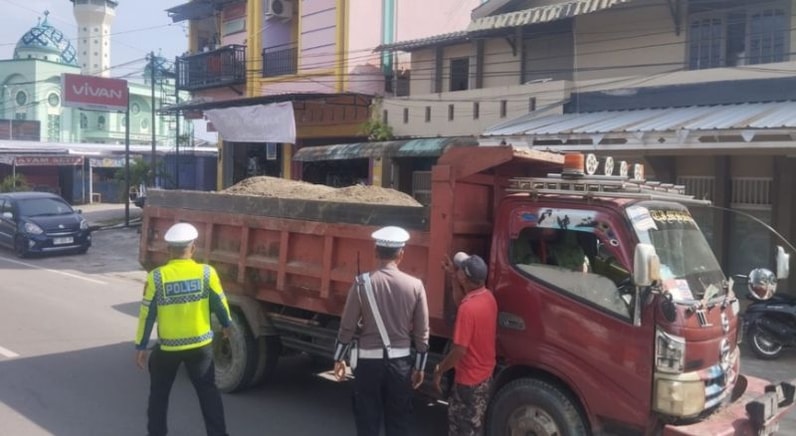 Dalam kegiatan tersebut, petugas memberikan teguran dan imbauan kepada pengemudi truk agar menutup muatan material pasir dengan terpal guna mencegah gangguan dan potensi bahaya bagi pengguna jalan lain.
