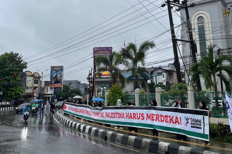 Samarinda - Massa dari Koalisi Masyarakat Kalimantan Timur Cinta Palestina menggelar aksi solidaritas bela Palestina dengan tajuk yang sama All Eyes On Rafah di depan Masjid Al-Ma'ruf pada Minggu (4/5/2024).